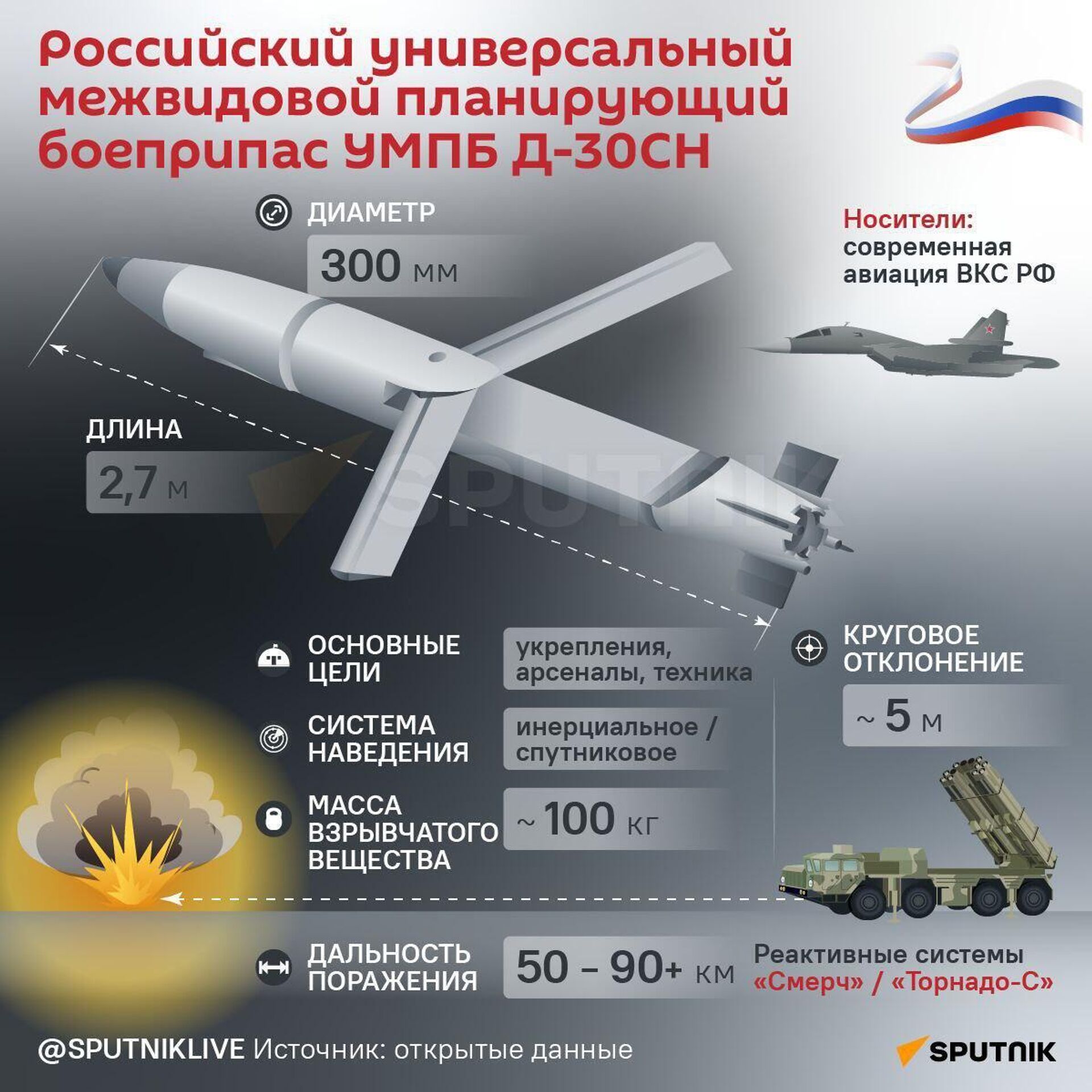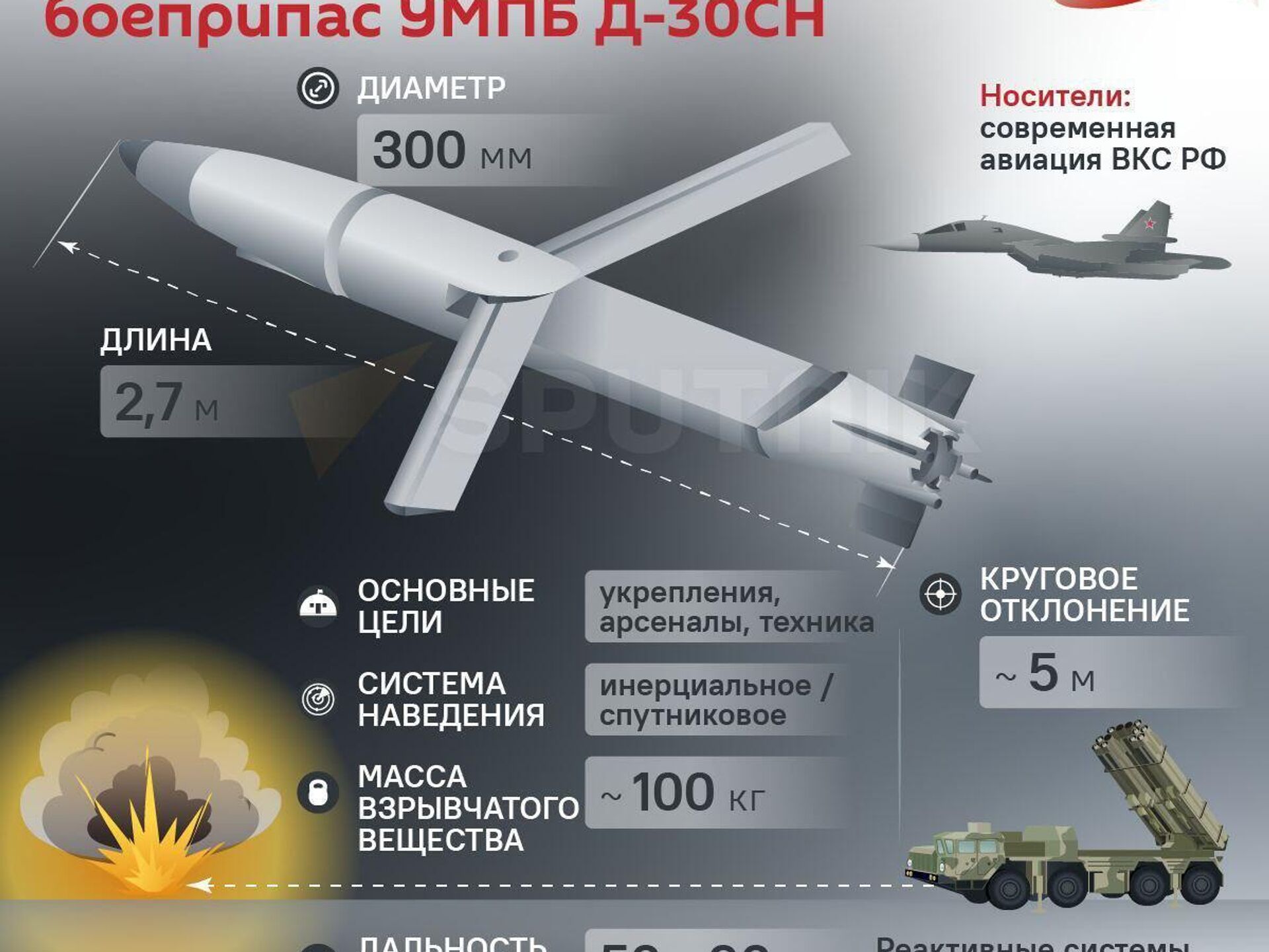 ▪ Есть "брат" на той стороне. УМПБ Д-30СН – изделие созданное по аналогии с ФАБ-250 и близкое к западному боеприпасу GBU-39/B SDB. Это управляемая авиабомба со специальным реактивным ускорителем (в варианте GLSDB), которую можно установить и на M142 HIMARS.