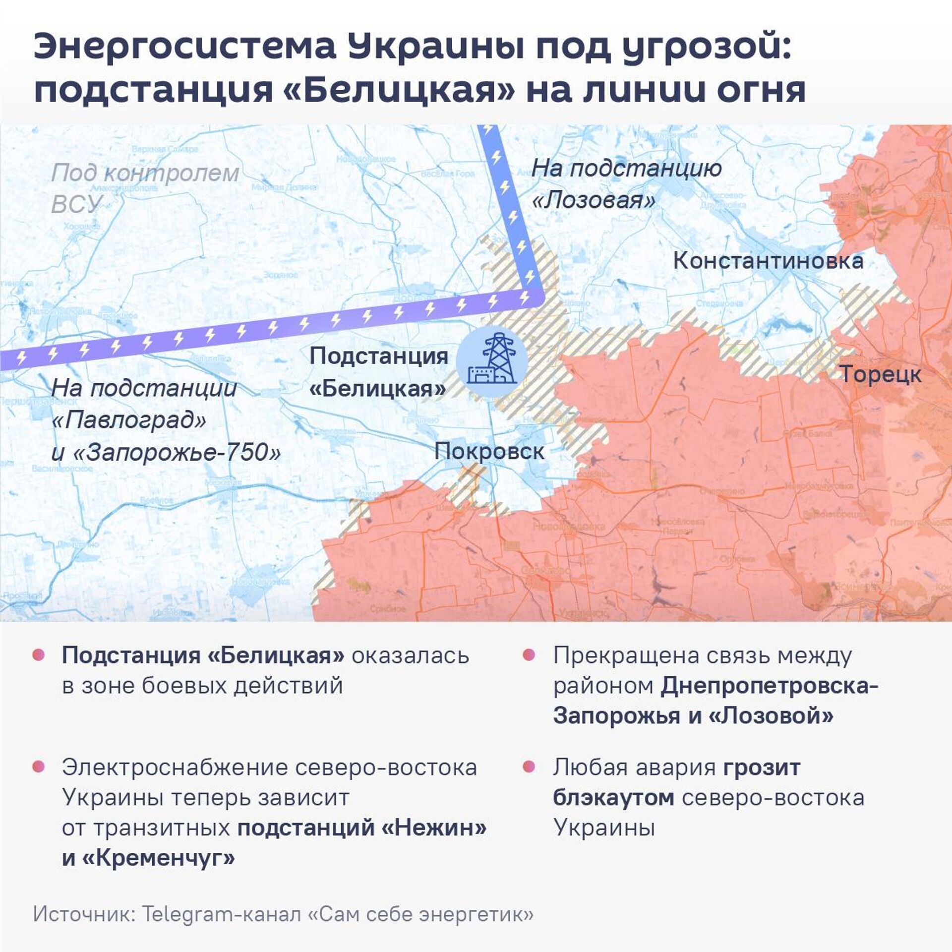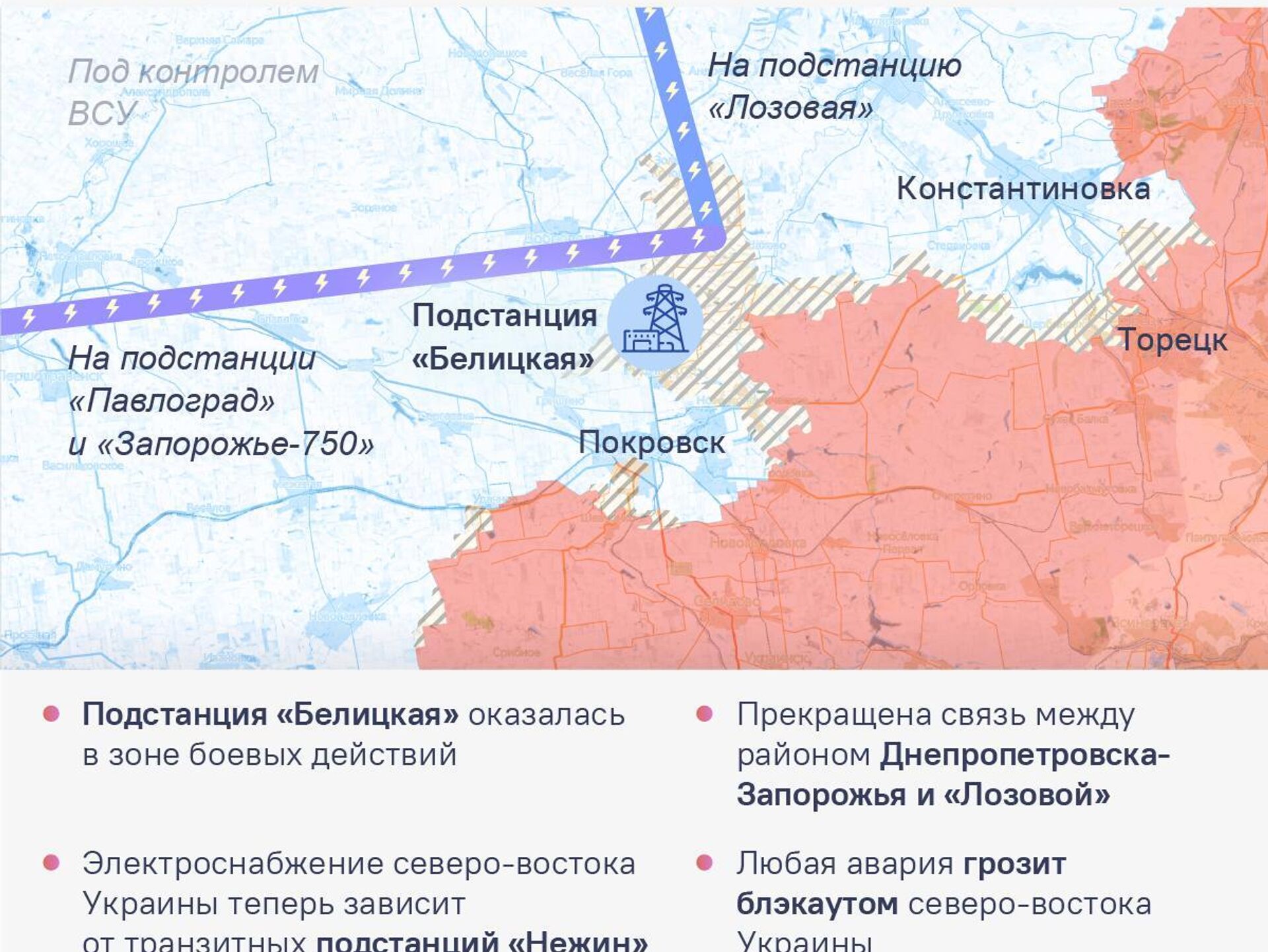 ▪ Энергетический удар по ВСУ. До прорыва наших войск подстанция "Белицкая", вероятнее всего, питала всю прифронтовую полосу украинских войск на стыке ДНР, Днепропетровской и Запорожской областей, включая вражеские гарнизоны Покровска и Мирнограда.