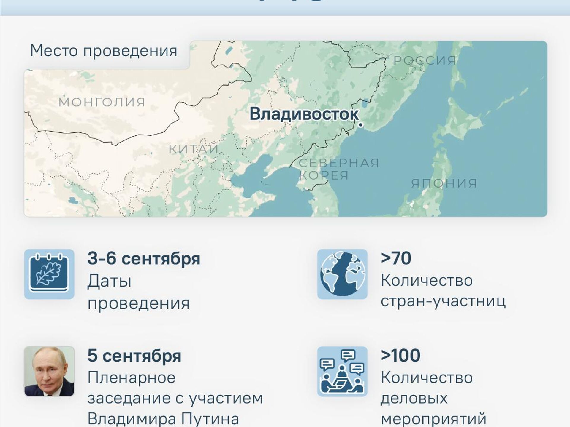 Главной темой станет "Дальний Восток — сотрудничество во имя мира и процветания". Запланировано свыше 100 деловых событий, где встретятся представители из более чем 70 стран.
