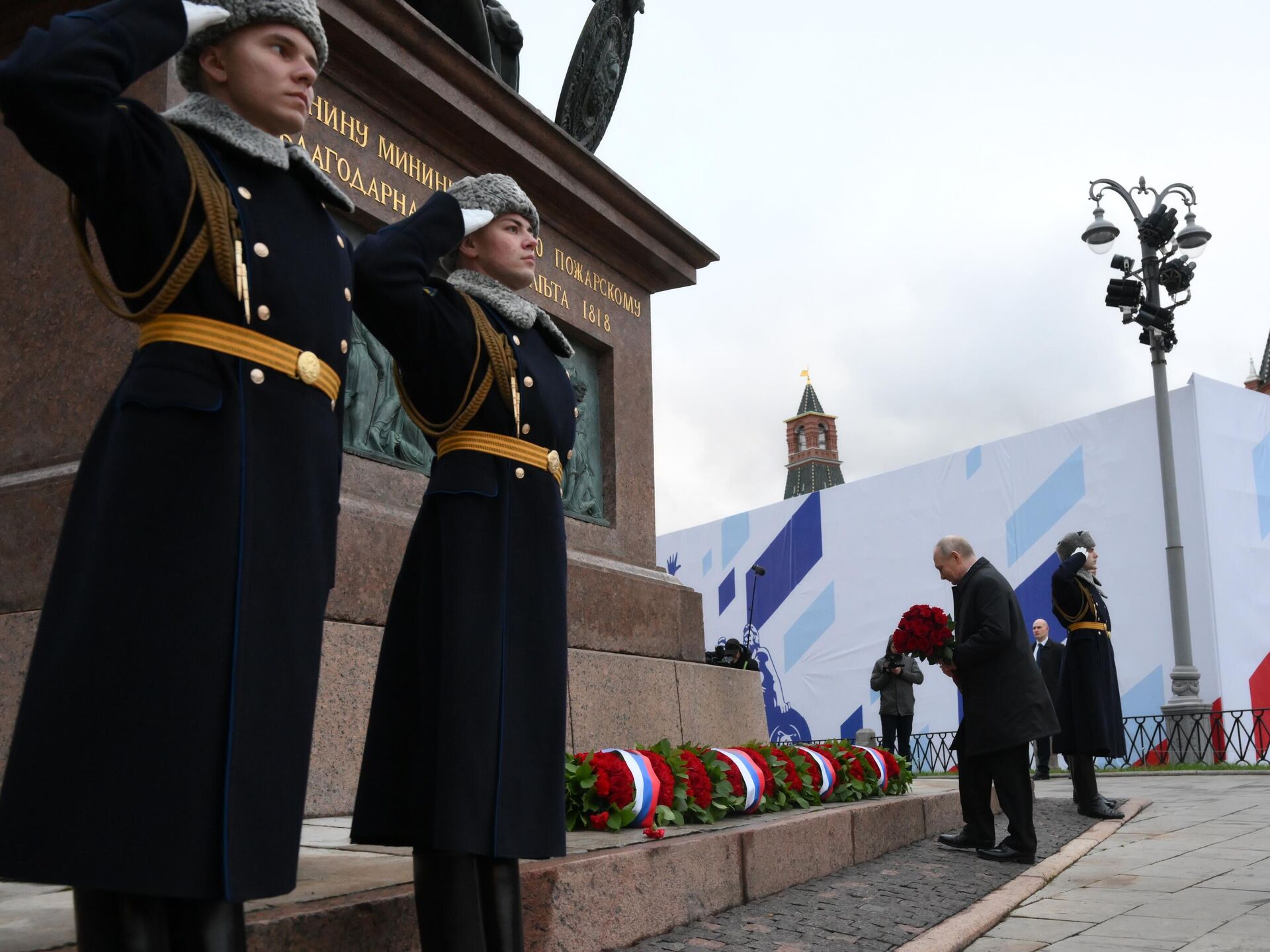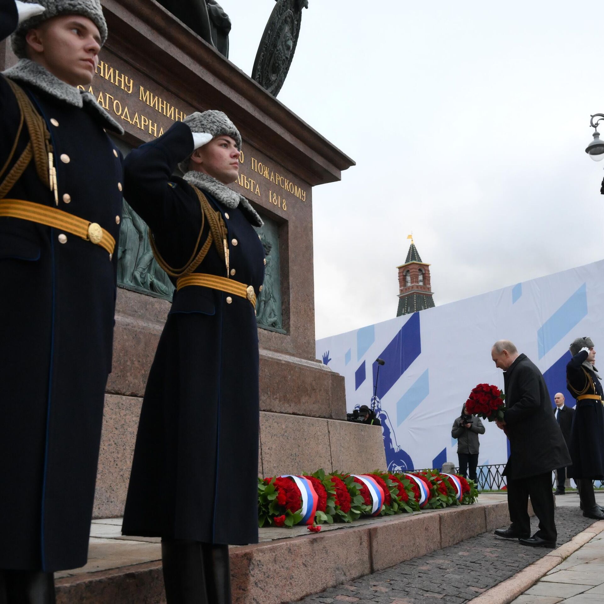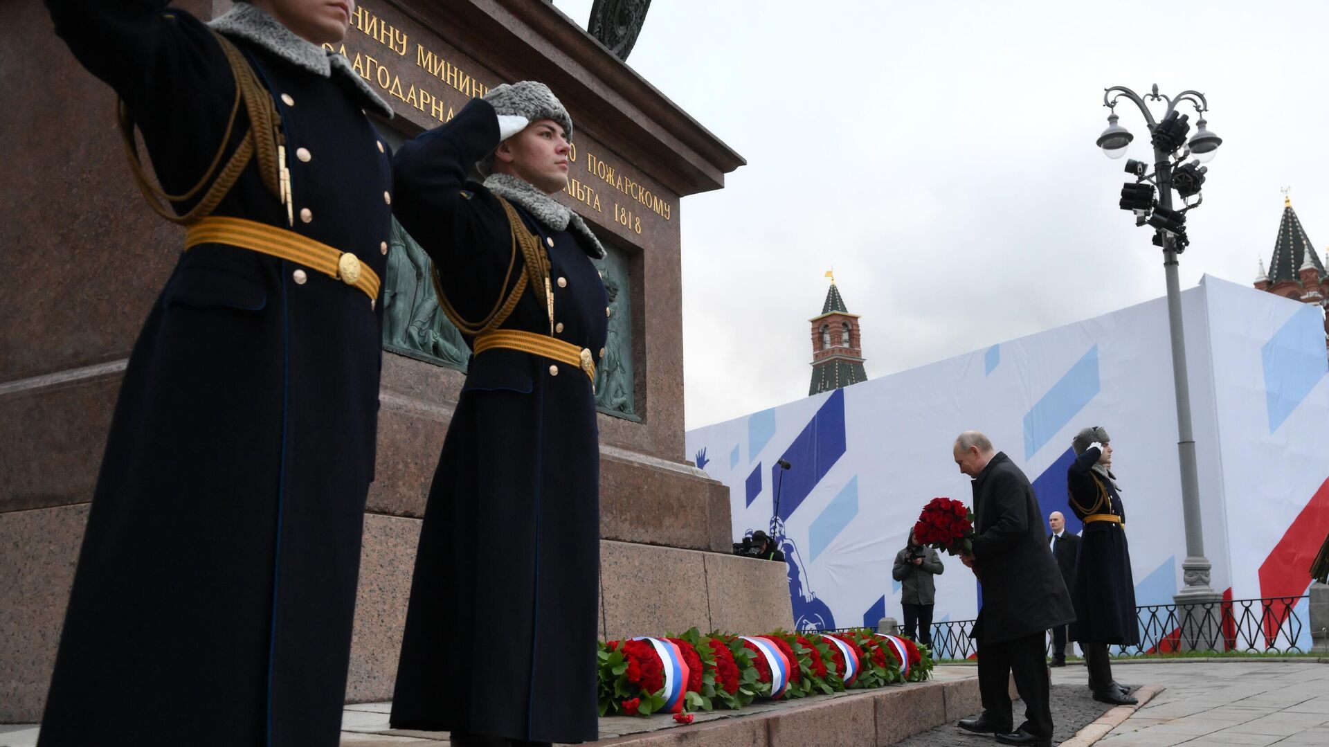 ЦХИНВАЛ, 4 ноя — Sputnik. Президент России Владимир Путин в День народного единства возложил цветы к памятнику Кузьме Минину и Дмитрию Пожарскому на Красной площади в Москве, отдавая дань уважения подвигу народных героев.В церемонии вместе с главой государства приняли участие представители ведущих религиозных конфессий России, а также лидеры общественных и молодежных организаций. Путин тепло поприветствовал каждого из участников мероприятия.Под торжественные звуки военного оркестра почетный караул возложил к подножию монумента гирлянду из цветов, украшенную лентой в цветах российского триколора, символизируя нерушимое единство и силу государства.День народного единства, ежегодно отмечаемый в России 4 ноября, является государственным праздником, учрежденным по инициативе Межрелигиозного совета России в 2005 году. Он посвящен памяти о ключевых событиях 1612 года, когда народное ополчение под предводительством Кузьмы Минина и князя Дмитрия Пожарского проявило беспримерное мужество, освободив Москву от польских интервентов и сохранив независимость российского государства.