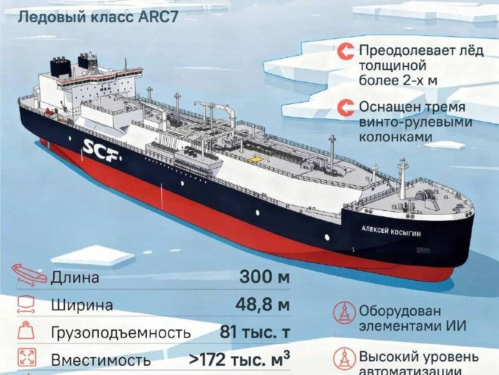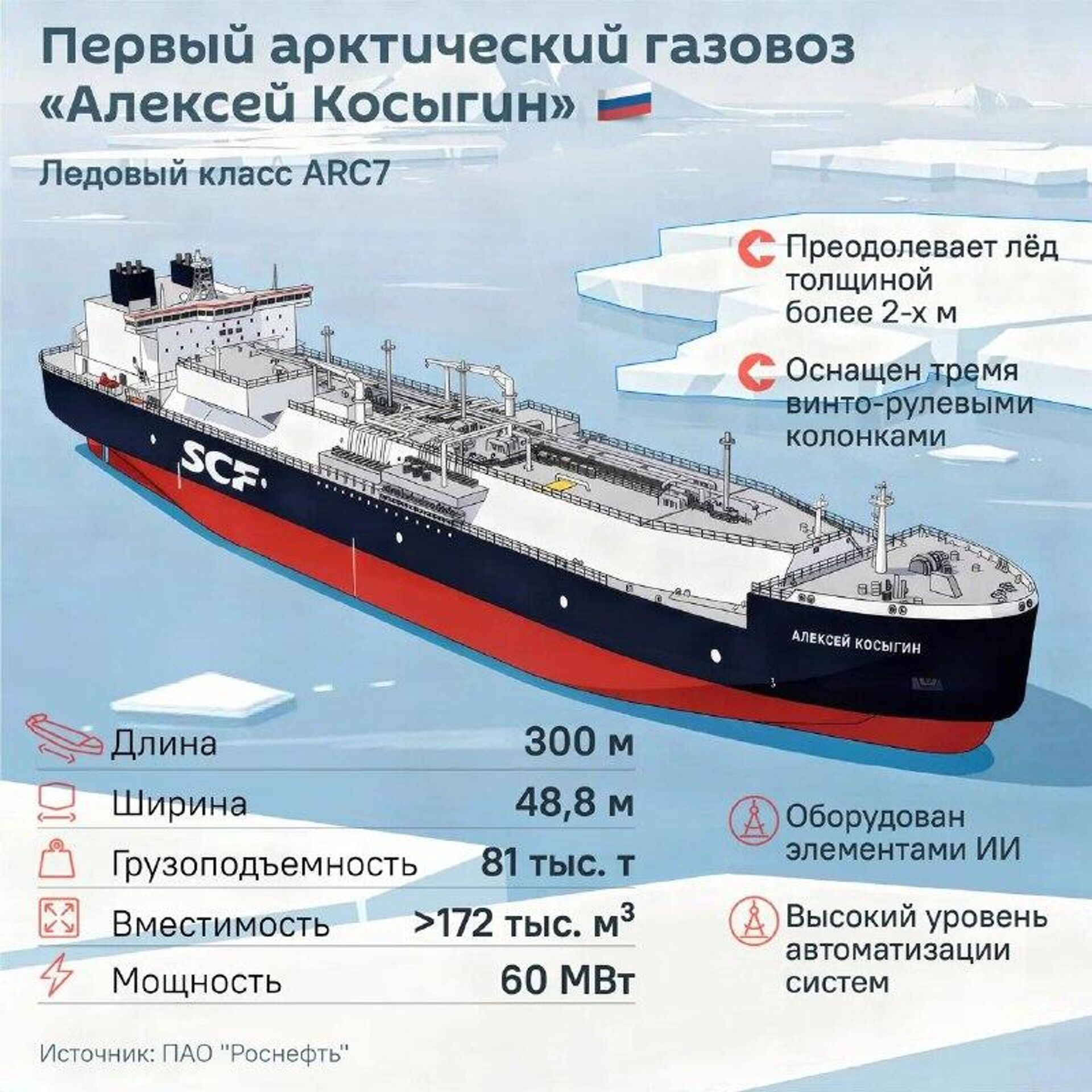 Корпусу придают ледокольные обводы для движения во льду толщиной более 2 метров. Также газовоз оснащают винторулевыми колонками, позволяющими ему двигаться как носом, так и кормой в ледовых условиях, подытожил эксперт.