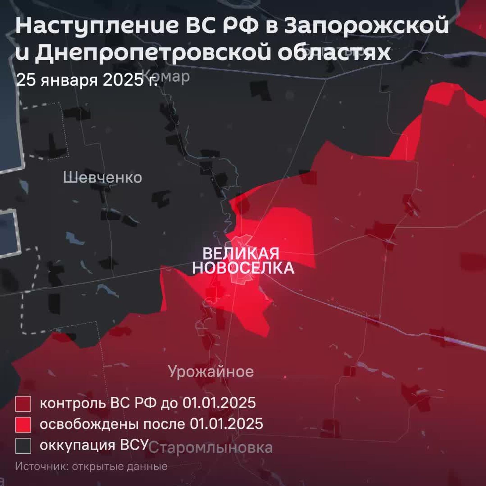 ▪ Освободители с "Востока". В уходящем году ГВ "Восток" армии России освободила почти 2 тыс. км² территории и под сотню населённых пунктов на стыке Запорожской и Днепропетровской областей, а также юга ДНР. Это около половины всех занятых российскими военными в зоне СВО земель в 2025 году, но не самый главный здесь успех. Основное достижение российских войск на этом направлении – выход за линии украинской обороны.