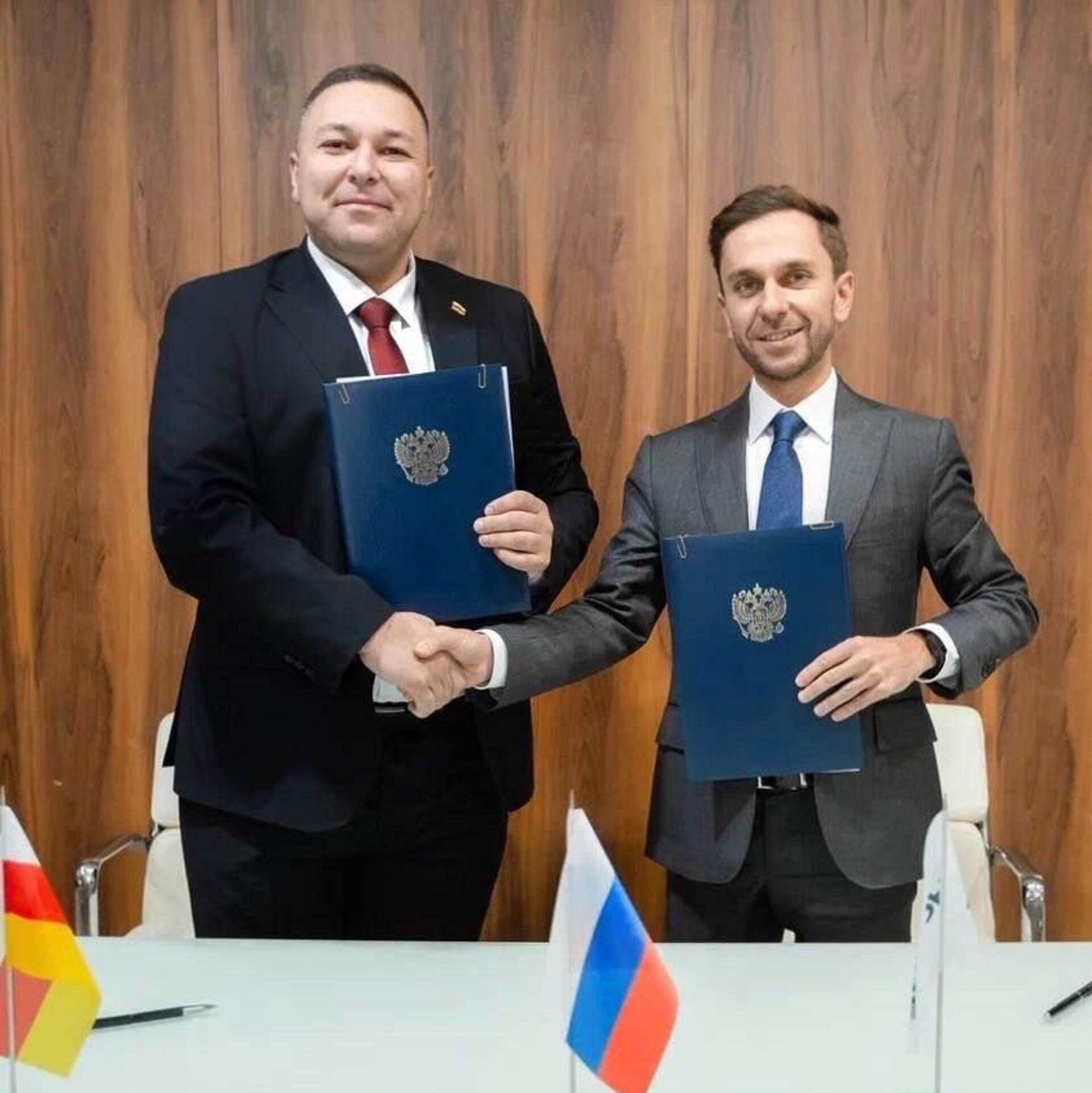Свои подписи под документом поставили генеральный директор Общества "Знание" Максим Древаль и заместитель руководителя администрации президента Южной Осетии Алан Тибилов.