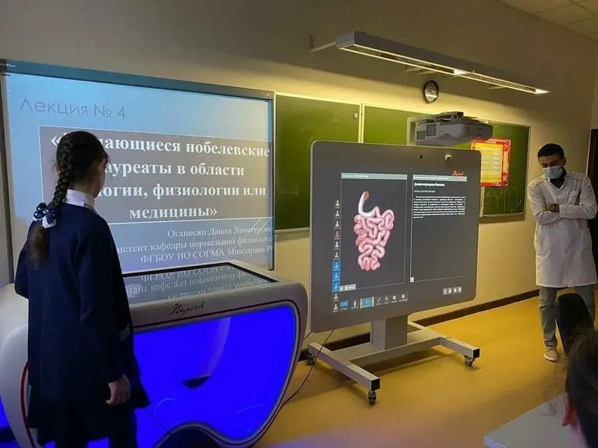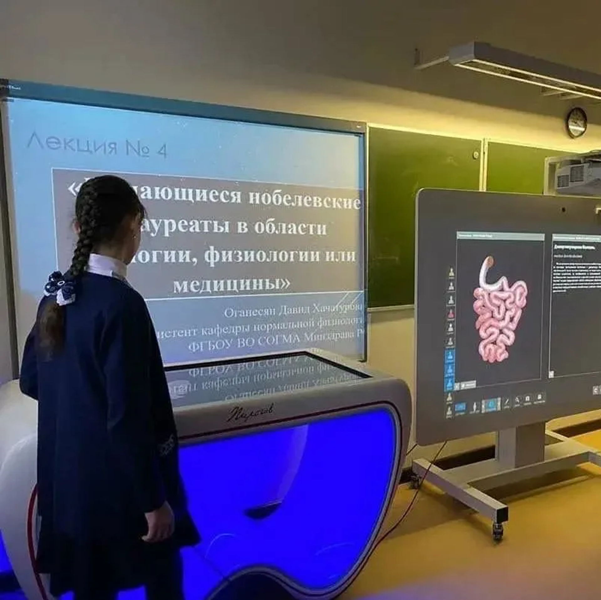 Профильные классы оснащены интерактивными столами "Пирогов", 3D-атласами по анатомии, виртуальными лабораториями, а также тренажерами для отработки хирургических навыков и сердечно-легочной реанимации.