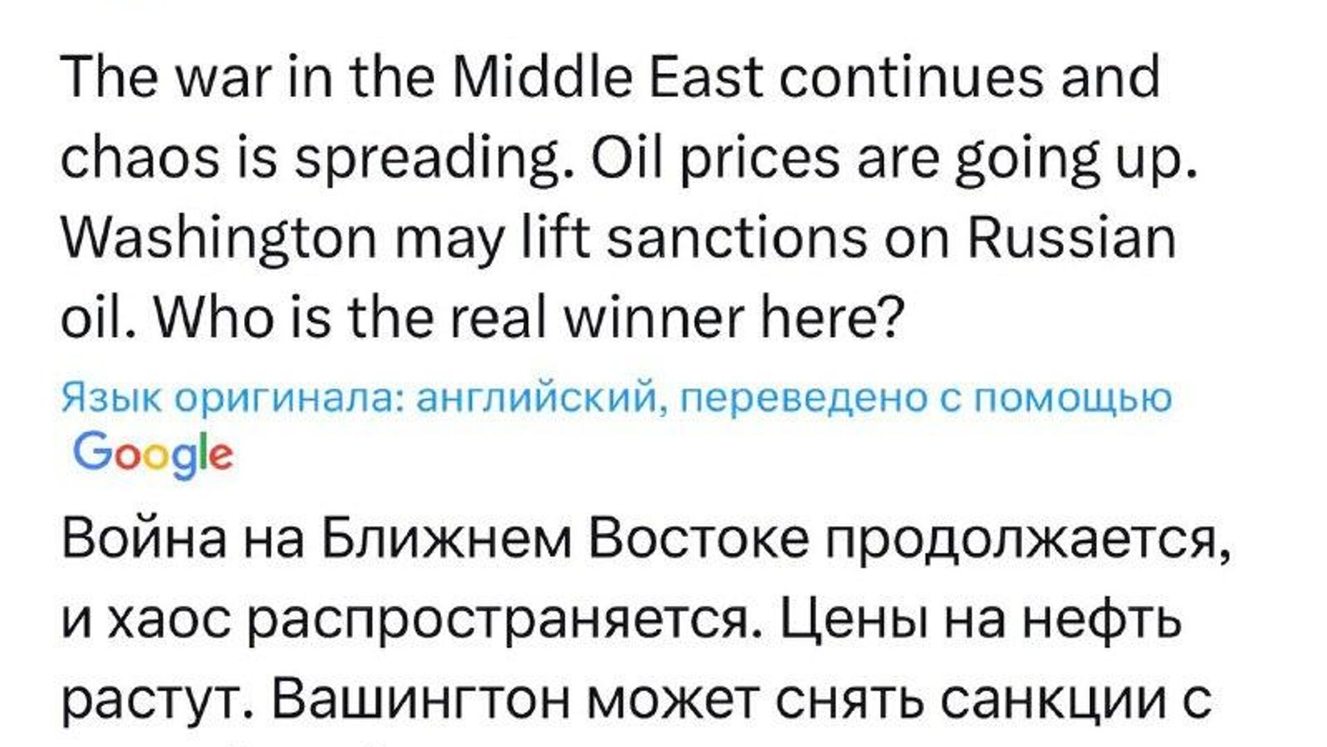 "Цены на нефть растут. Вашингтон может снять санкции с российской нефти", — написал он в соцсетях на фоне заявлений Трампа о том, что Иран якобы проигрывает в конфликте.