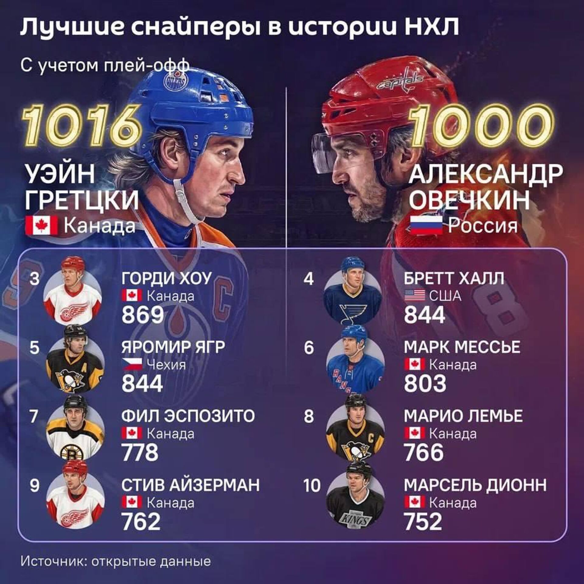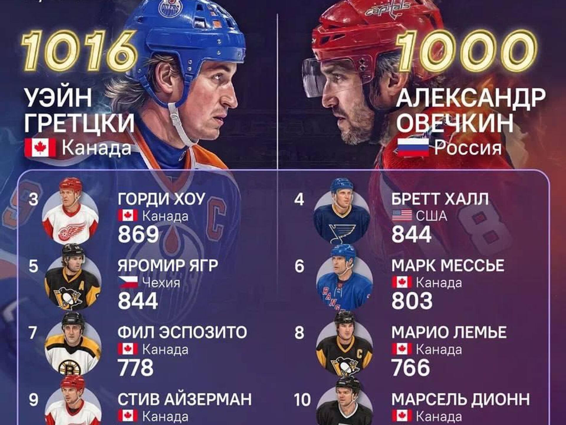 Овечкин стал вторым в истории НХЛ игроком, кому удалось достичь отметки в 1000 голов за всю карьеру в лиге. Опережает российского хоккеиста канадец Уэйн Гретцки — ему удалось забить 1016 голов.