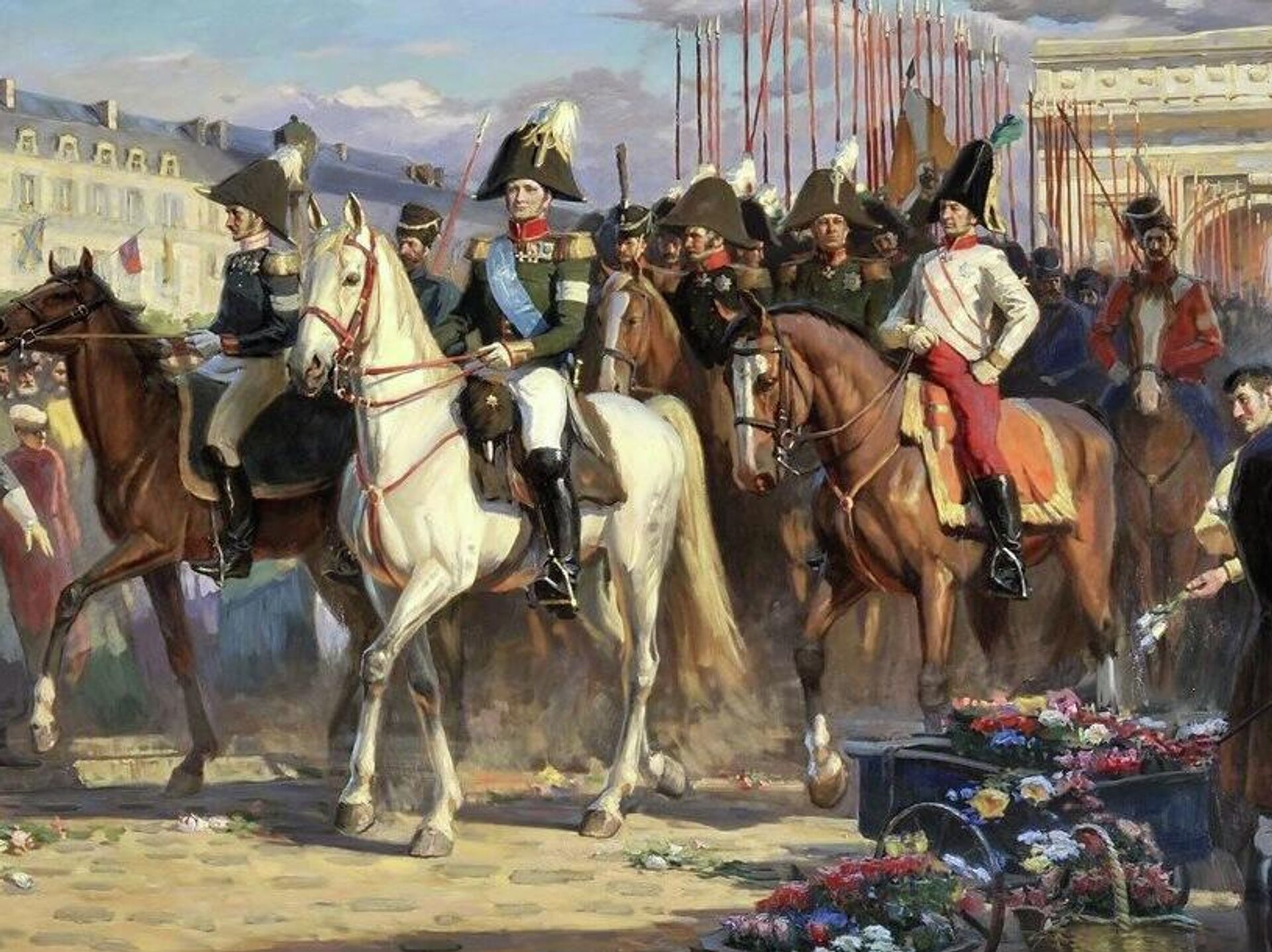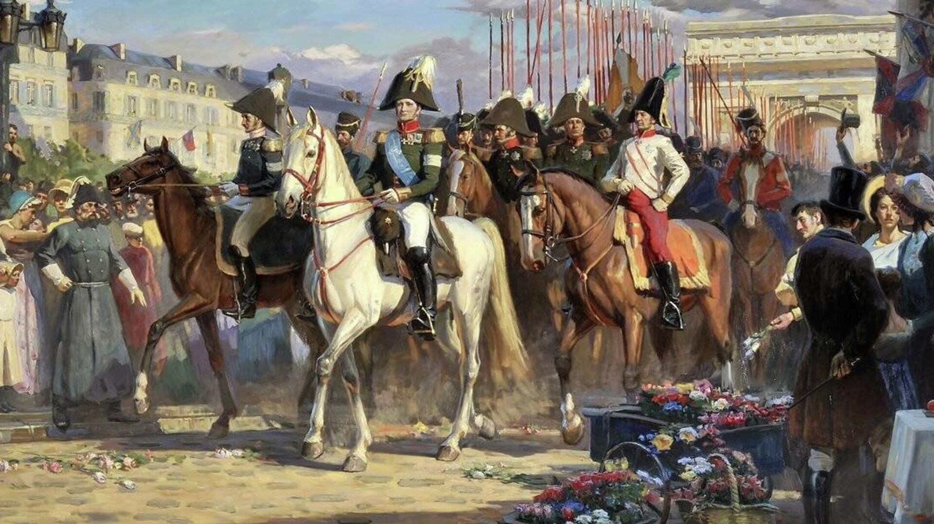 В полдень русская гвардия во главе с Александром I торжественно вступила в столицу Франции. Император проявил великодушие и сдержал обещание не грабить город и обеспечить его жителям покровительство, даже не взяв с Франции репараций, за что его называли "освободителем" Европы.