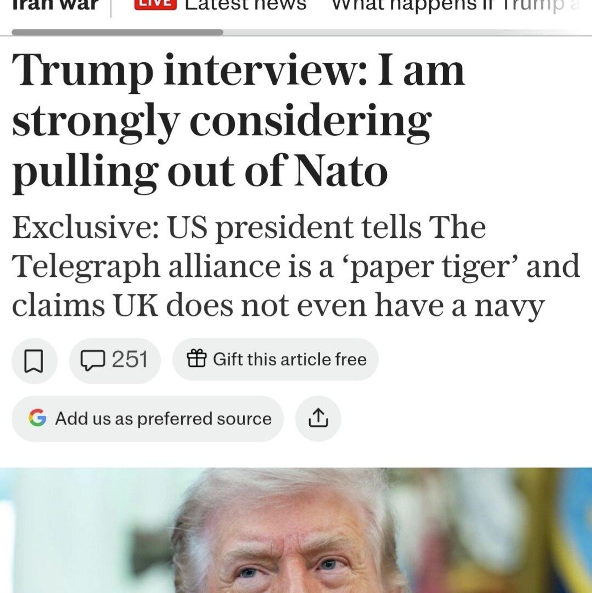 Трамп заявил, что "всерьёз задумался" о выходе США из НАТО, так как страны альянса не присоединились к войне против Ирана."НАТО никогда не оказывало на меня влияния. Я всегда знал, что они — бумажные тигры, и Путин, кстати, тоже это знает". Спутник Ближнее зарубежье в MAX