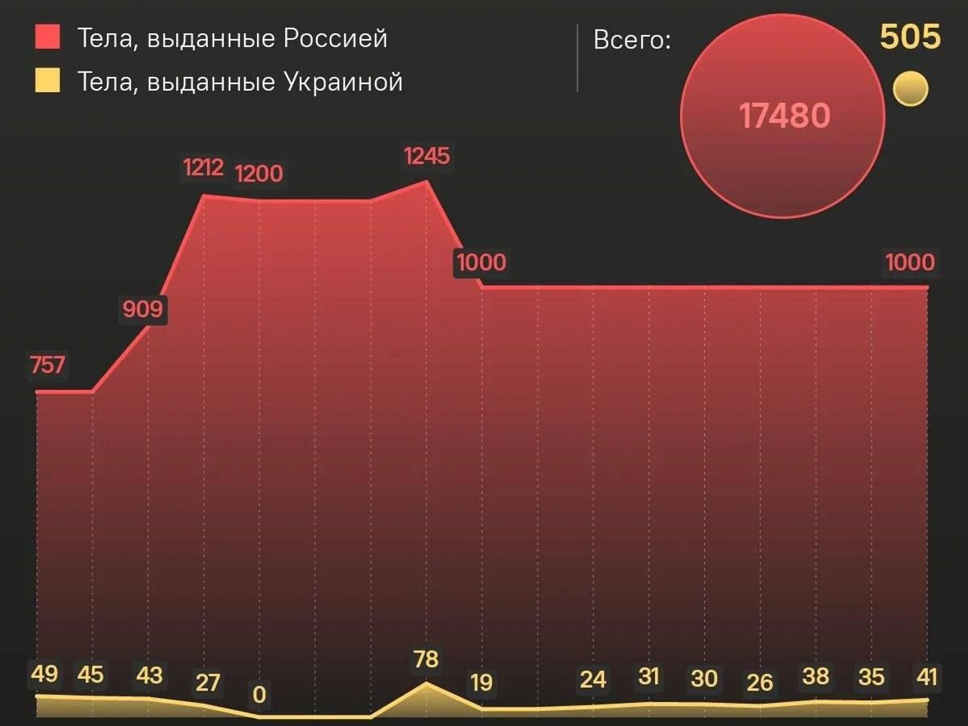 Всего Россия передала Украине 17 480 тел военных ВСУ, получив взамен 505 тел бойцов ВС РФ